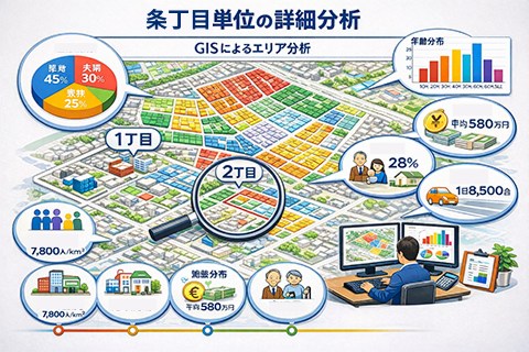 GISにより「ターゲットが多く住んでいる条丁目」を可視化できます。