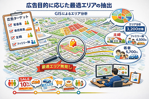 GISにより、人口・年齢層・世帯構成などのデータをもとに配布すべきエリア/外すべきエリアが明確になります。
